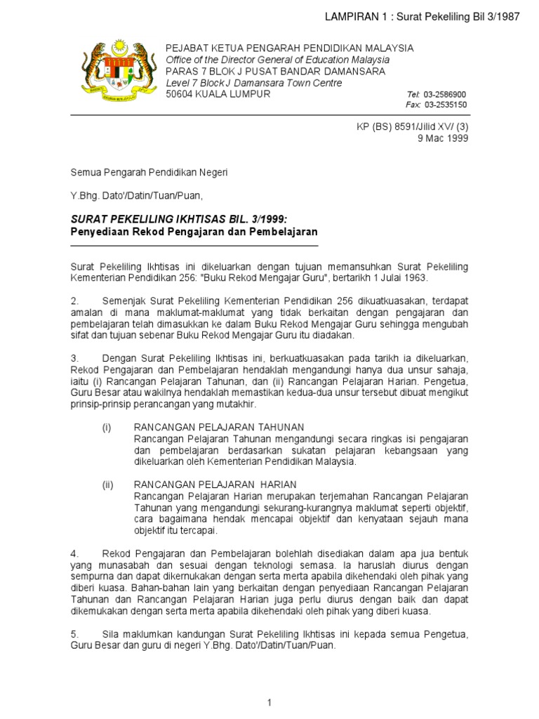 Dengan Surat Pekeliling lkhtisas ini berkuatkuasakan pada tarikh ia dikeluarkan Rekod Pengajaran dan Pembelajaran hendaklah mengandungi hanya dua unsur sahaja iaitu i Rancangan Pelajaran Tahunan dan ii Rancangan Pelajaran Harian. Principles and Practice of College Health John A. Surat-surat pekeliling ikhtisas Kementerian Pelajaran Malaysia 1969-1978 Pengurusan Disiplin Murid Edisi Kedua adalah edisi yang dikemaskini dengan maklumat-maklumat baru dan pekeliling terkini.